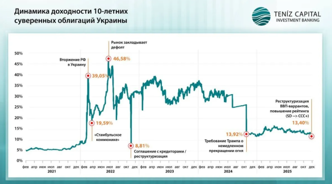 — До 2022 года 10-летние суверенные облигации Украины торговались вблизи 100-110% от номинальной стоимости. После вторжения РФ в Украину в конце февраля 2022 года, цены обвалились и опускались до 19-20% в начале марта, отражая сценарий глубокого кредитного стресса и ожидания дефолта. Потом ситуация стала интересней, так как дальнейшее движение — это уже не экономика в классическом смысле, а торговля ожиданиями: переговоры, реструктуризация, политические сигналы, ожидания деэскалации. Другими словами, с локальных минимумов в диапазоне 15-20% в марте–июле 2022 года цена на пике в конце 2025 — начале 2026 г. (выше 62%) выросла более чем в 3 раза, что соответствует росту примерно на +200% исключительно за счет переоценки риска.
